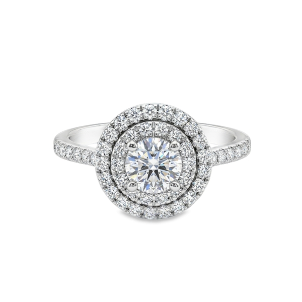 A stunning piece of timeless elegance, this 18K white gold Double Halo Diamond Ring is designed to capture and reflect light from every angle. It features a brilliant round-cut center diamond encircled by two concentric halos of smaller accent diamonds, creating a larger look. The sparkle is further amplified by a delicate pavé-set diamond band that extends halfway down the shank. This classic yet extravagant design is the perfect symbol of enduring love. It is an ideal choice for an engagement ring or a spectacular anniversary gift. The central diamond has a laser inscription and it is certified by the Gemological Institute of America with a GIA Report no 1483659091.