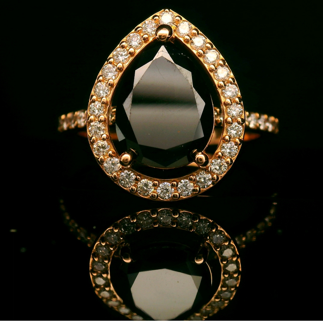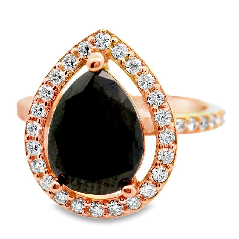 This beautiful 18K rose gold engagement ring features a striking black pear-cut diamond at its center. This unique diamond is surrounded by a dazzling halo of smaller, clear diamonds, making it truly stand out. The slender rose gold band also sparkles with tiny diamonds, adding to the ring’s overall shine and elegance. The warm color of the rose gold creates a lovely contrast with the deep black diamond and the bright white accents, making this ring a perfect choice for those who love both classic beauty and modern style.