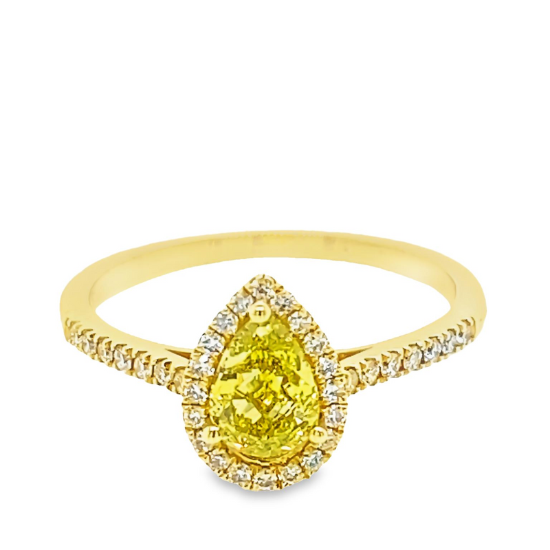 This exquisite engagement ring is a perfect symbol of love and commitment. It offers a bold and unique take on the classic design. The ring showcases a vibrant 0.58 carat pear modified brilliant-cut central diamond which boasts a captivating Fancy Intense Yellow color (Treated). It is securely set in an elegant 18K yellow gold setting. The striking main stone is beautifully accentuated by a brilliant halo of smaller white diamonds, enhancing the size and brilliance of the pear shape. These accent diamonds continue onto the sleek band, adding continuous sparkle for a total weight of 0.20 carats.