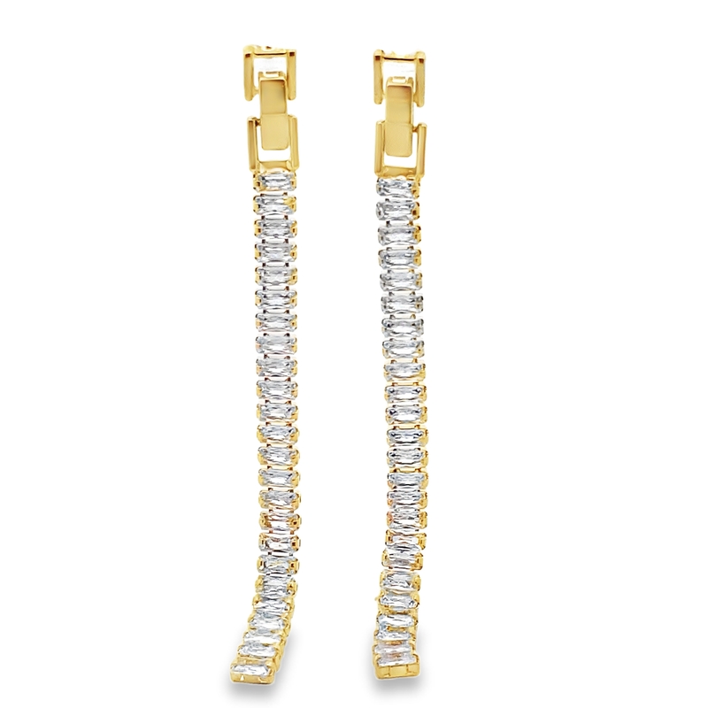 These elegant earrings feature a long, linear design with sparkling cubic zirconia stones. The gold-tone metalwork adds a touch of glamour and sophistication. The dangling design creates movement and draws attention to the face.