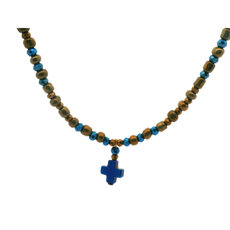 The necklace has a contemporary and casual appeal, blending rustic metallic tones with bold, modern blue accents. The mix of textures (smooth cross, faceted beads, metallic beads) adds visual interest. It’s a versatile piece, suitable for adding a pop of color and symbolic meaning to everyday outfits.