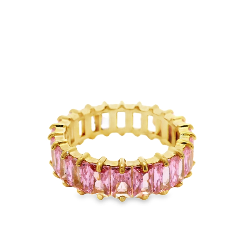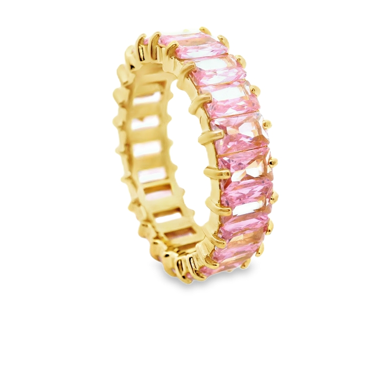 This fashion ring is a statement piece that exudes sophistication and glamour. The vibrant pink stones and the sleek baguette cut create a modern and eye-catching design. It’s perfect for adding a touch of color and sparkle to any occasion.
