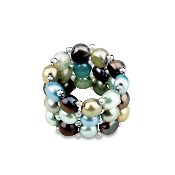 The design highlights a beautiful assortment of multi-colored pearls. The pearls are securely held in place by small, polished spacers. It is expertly assembled on a durable silicone base. The stretchable silicone allows the ring to glide easily over the knuckle and sit comfortably on various finger sizes.