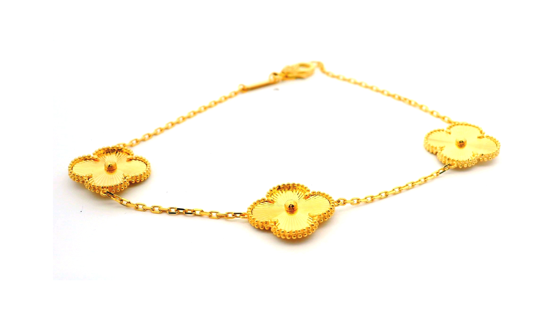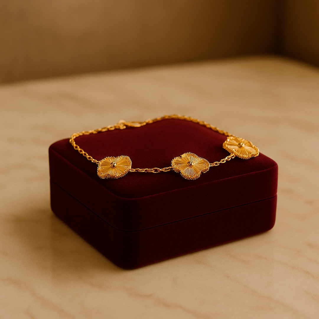 Adorn your wrist with luck and luxury. This exquisite 18K Yellow Gold Bracelet features three iconic four-leaf clover charms, each finished with the stunning light-reflecting Guilloché sunburst texture and delicate beaded borders. The charms are perfectly spaced on a dainty 18K gold chain. Effortlessly chic on its own or perfect for layering, this bracelet is a sophisticated symbol of good fortune.