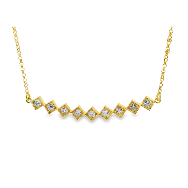 The necklace showcases a gracefully curved bar adorned with a series of sparkling Cubic Zirconia (CZ) stones, each set within a distinctive geometric diamond-shaped bezel. The textured edges of each setting add a unique artisan touch, enhancing the brilliance of the stones. Crafted from high-quality 925 Sterling Silver and beautifully finished with radiant Yellow Gold Plating, this necklace offers the luxurious look of solid gold at an accessible price. It’s perfect for layering or as a standout solo statement. This beautiful necklace makes an ideal gift for birthdays, anniversaries, or a special treat for yourself. It comes with an adjustable chain.