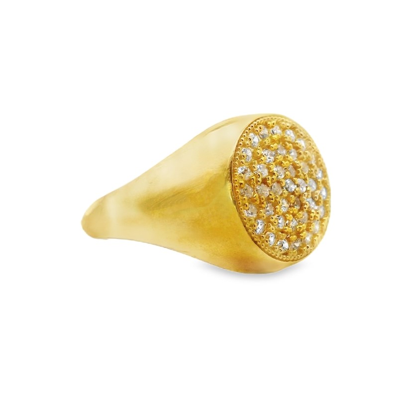 Make a timeless, confident statement. This striking ring gives a luxurious feel. It is crafted from durable 925 Sterling Silver. The ring is finished with a rich layer of Yellow Gold Plating. This provides a high-end, polished look. The design is a modern take on the classic signet ring. The flat face showcases a brilliant, circular display of Cubic Zirconia (CZ) stones. The stones are set in a dense, shimmering pave style. The halo effect catches the light from every angle. The band is smooth and polished. It is designed for comfortable wear. This piece blends heritage style with affordable, eye-catching glamour. It is an essential item for any collection.