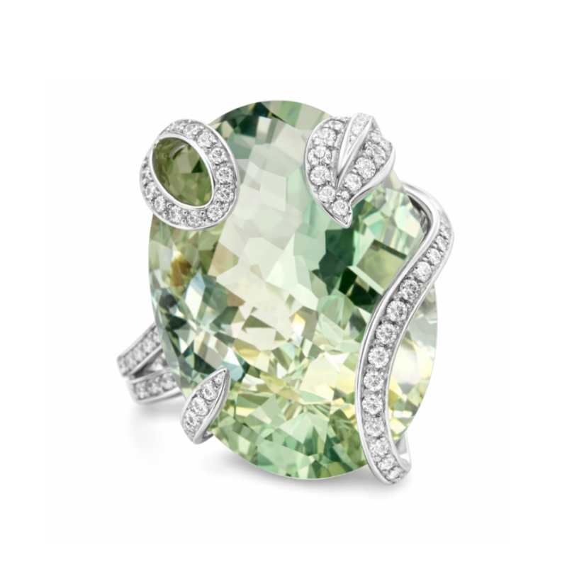 The Green Amethyst Diamond Ring is a striking masterpiece of modern luxury and refined elegance. It is expertly crafted in high-quality 18K white gold to provide a sleek, polished backdrop for its vibrant stones. Specifically, the center of the ring features a magnificent 23.28-carat oval-cut natural green Amethyst. This substantial gem exhibits a tranquil light-to-medium green hue that captures the light beautifully. Its expertly cut facets ensure that the ring sparkles brilliantly from every angle.