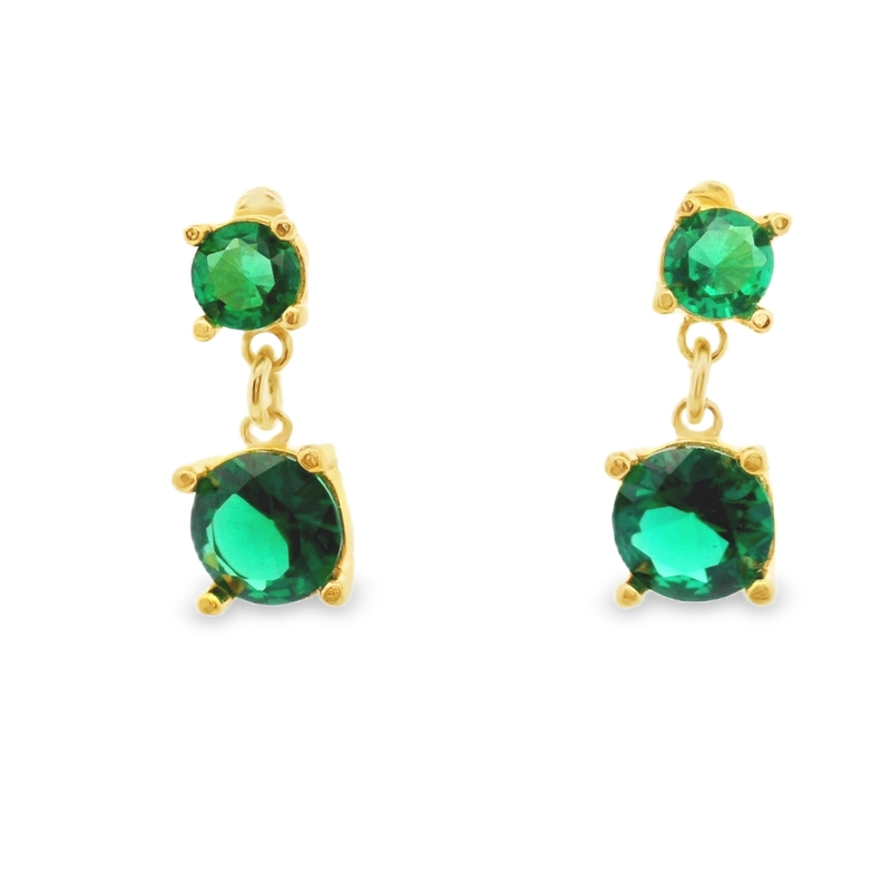 Add a vibrant splash of color to your look with these elegant Green Stone Drop Earrings. They feature two stunning, round-cut Cubic Zirconia stones in a vivid emerald green. These earrings offer a rich, classic look. Each stone is securely held in a four-prong setting. A smaller stone serves as the stud, and a larger stone gently hangs below. Crafted in sterling silver with gold plating, these earrings are a timeless piece. They are perfect for holiday dressing or a sophisticated everyday accent.