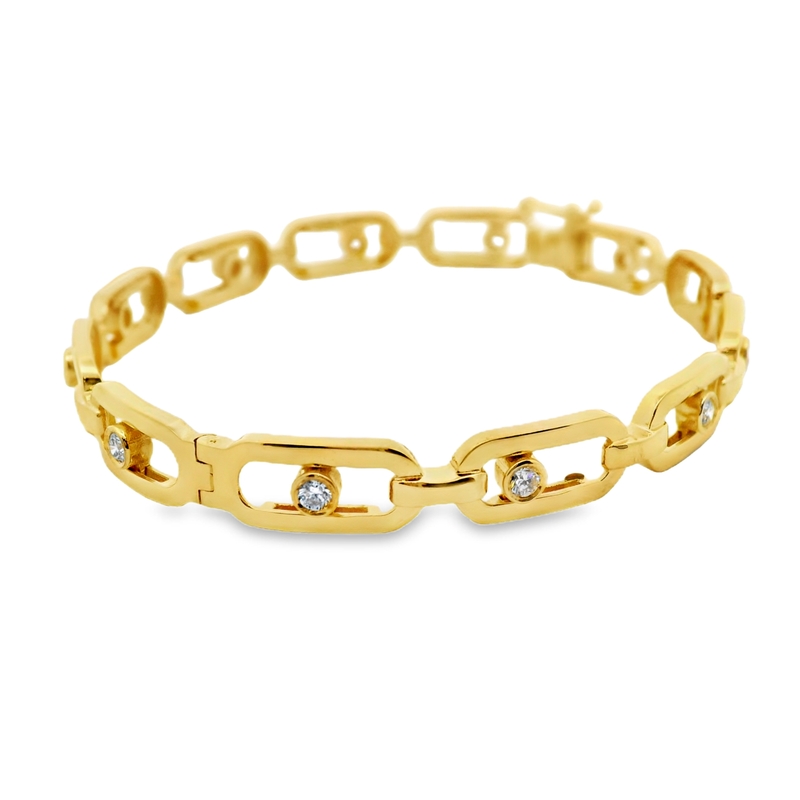 This bangle is a statement piece that would make a unique and eye-catching addition to any jewelry collection. Its modern design and luxurious materials make it a standout piece. This modern and sophisticated bangle showcases a unique, alternating open rectangle link chain crafted in polished 18K yellow gold. The design features several station links, each holding a single, dazzling round-cut diamond. These diamonds, totaling 0.40 carats with high VS clarity and G color, move freely within their bezel settings. These diamonds are not fixed; they are designed to move freely within the links, adding a dynamic element to the bangle’s design. This movement creates a captivating play of light and sparkle as the wearer moves. This piece creates a graceful drape on the wrist, offering a luxurious and contemporary take on the classic link bangle.