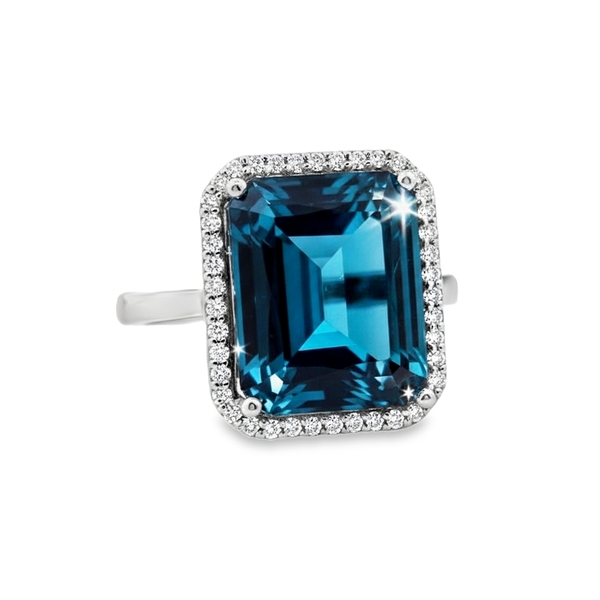 The center of this ring features a striking, large emerald-cut London Blue Topaz, renowned for its deep, velvety blue hue. To amplify its radiance, a delicate halo of smaller, sparkling diamonds encircles the topaz, creating a vibrant contrast against the cool tones of the 18K white gold. The simple, polished shank ensures that all focus remains on the stunning center arrangement, allowing the light to capture the gemstone’s facets from every angle.