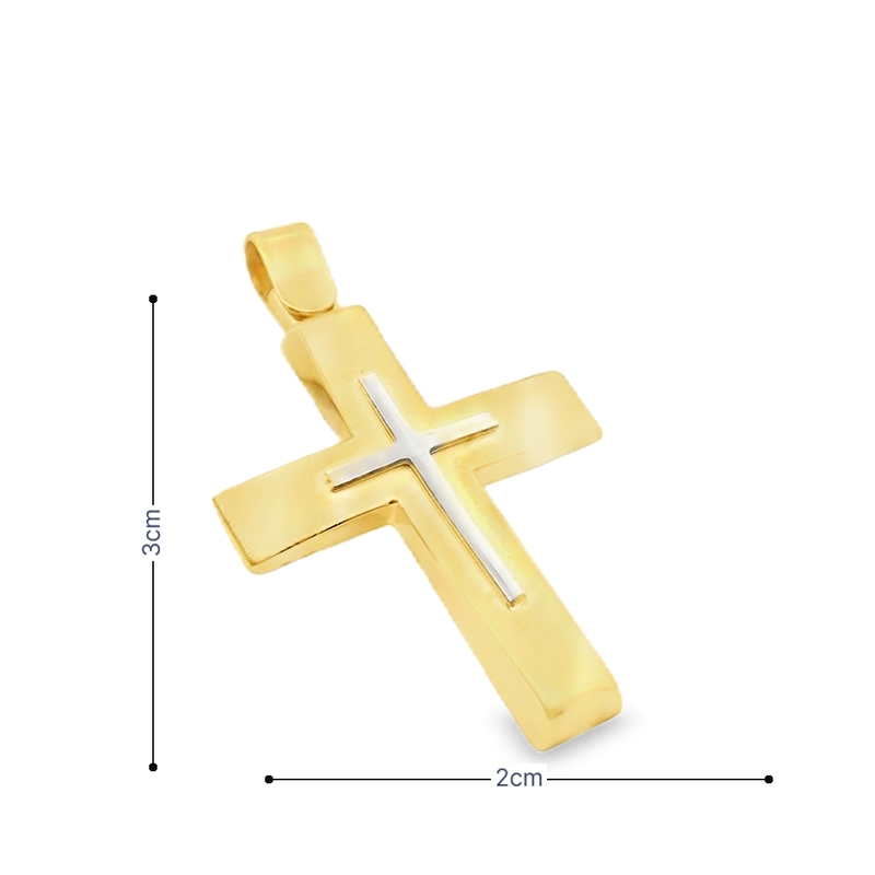 Make an elegant and sophisticated statement of faith with this beautiful two-tone cross pendant. The piece features a bold, dimensional base of 9K yellow gold with a sleek, highly polished finish. Layered directly on top is a thinner, 9K white gold cross that runs down the center, creating a stunning contrast and depth. This combination of metals and layered design offers a modern twist on the traditional symbol, making it an exceptional and eye-catching accessory for daily wear or special occasions.
