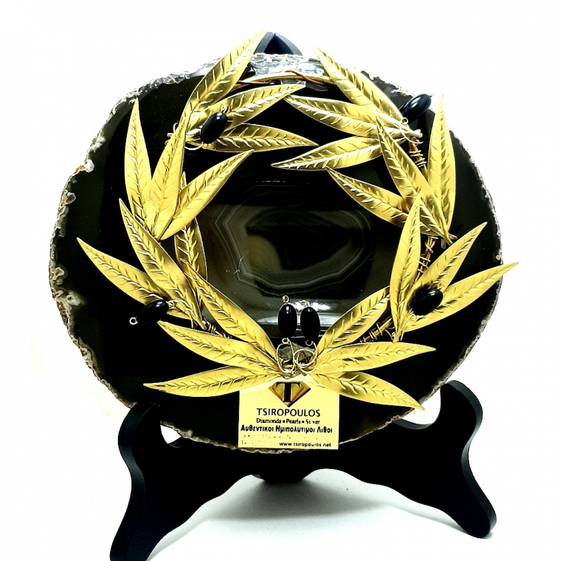 Gold Leaves Metal Wreath on a Slab of Agate.