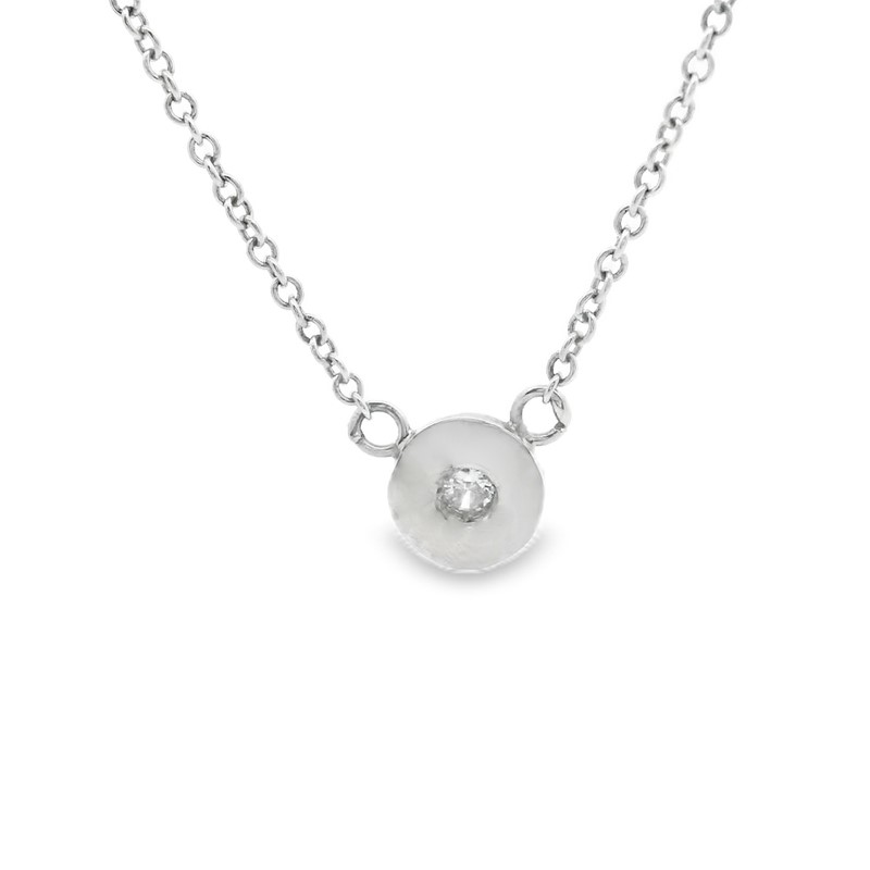 Elevate your everyday style with this exquisite 18K White Gold Necklace, featuring a delicate round pendant. The centerpiece is a small, sparkling solitaire diamond accent, set flush against a crisp, glossy white disc. The minimalist and modern design is suspended from a fine, shimmering white gold chain, making it perfect for layering or wearing solo. A timeless piece that adds a touch of subtle luxury and modern chic to any ensemble.