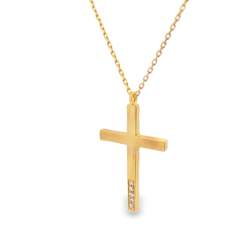 Celebrate your faith with this chic and contemporary 18K yellow gold cross necklace. Designed with a clean, minimalist silhouette, this pendant offers a sophisticated take on a timeless symbol. It’s perfect for daily wear and seamlessly transitions from casual to formal settings. The main body of the cross has a subtle polished finish, giving it a modern look. A striking detail is the row of pave-set natural diamonds elegantly set into the lower vertical arm of the cross. The cross hangs gracefully from a classic 18K yellow gold cable chain, known for its durability and delicate appearance.