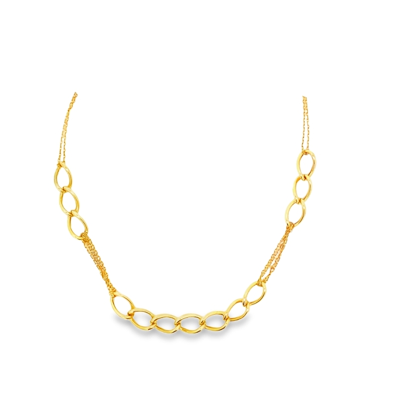 This stunning 18K Gold Oval Link Necklace showcases a series of polished, interlocking oval loops. We crafted each link from high-quality 18K yellow gold to ensure a radiant and lasting glow. The design features a unique combination of smooth, substantial links and delicate multi-strand chains. This mix of textures creates a sophisticated, modern aesthetic that catches the light beautifully from every angle.