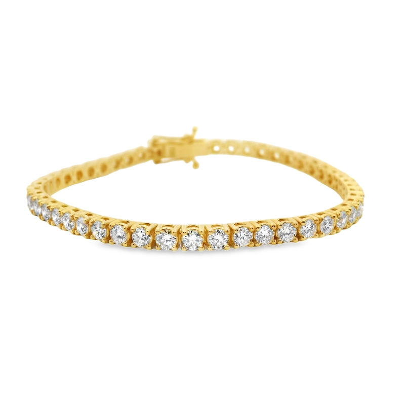 This stunning tennis bracelet is crafted from high-quality 925 sterling silver with yellow gold plating. It features a continuous line of excellent quality 4.0mm moissanite gemstones. Each moissanite weights 0.30 carat, 46 pieces, equivalent with a D color and VVS clarity rating. Each stone is meticulously set to create a dazzling display of light. Unlike cubic zirconia, moissanite is a superior gemstone with a higher refractive index, giving it a fiery, rainbow-like sparkle. With a hardness of 9.25 on the Mohs scale, moissanite is highly resistant to scratching, ensuring your bracelet remains brilliant for years to come.