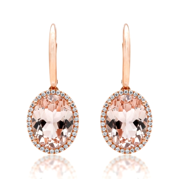 These gemstones are famous for their mesmerizing fire and gentle hues. Each center gemstone is surrounded by a halo of smaller diamonds, adding sparkle and enhancing the center stone’s beauty. The diamonds feature a total weight of 0.24 carats and are graded with VS clarity and G color. This high-quality selection ensures a sharp, icy brilliance that creates a beautiful contrast against the warm tones of the rose gold. Furthermore, the combination of sparkling diamonds and soft pink gemstones ensures these earrings are very eye-catching from every angle.