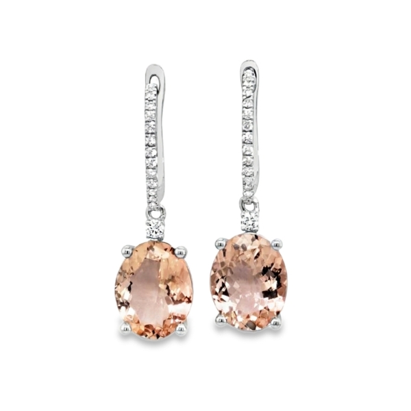 The earrings are elegantly held in a secure 18K white gold setting. We chose white gold for these Morganite and Diamond Oval Drop Earrings because it provides a neutral, mirror-like backdrop. This allows the true colors of the morganites and the brilliance of the diamonds to take center stage.