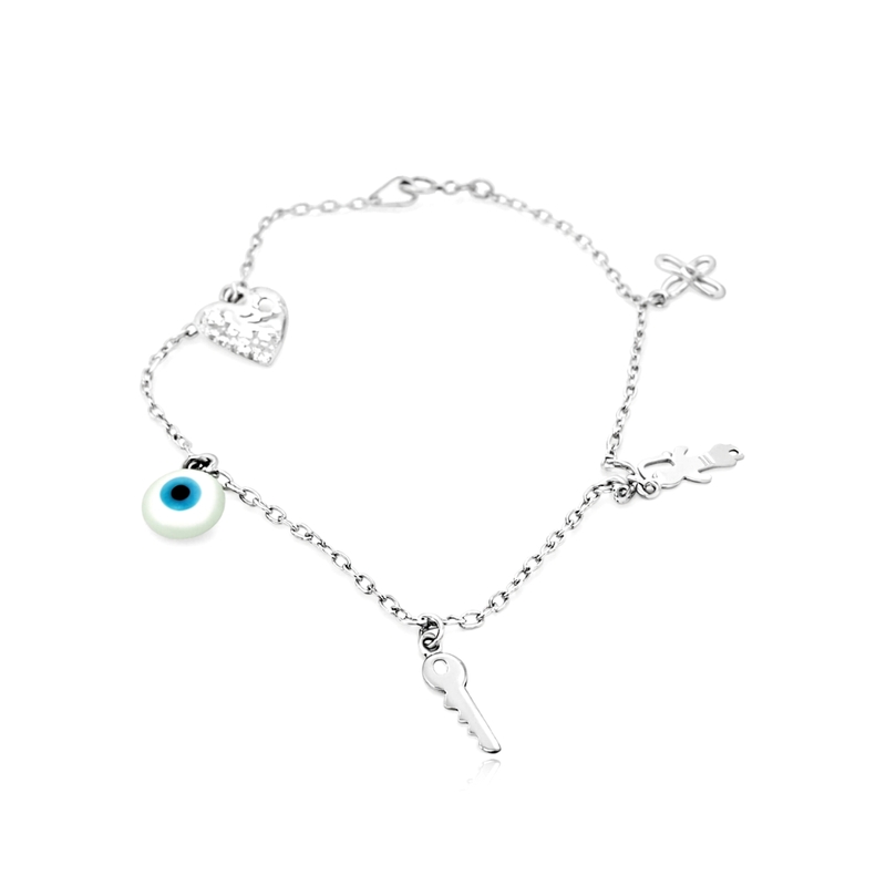 Whimsical and meaningful! This 18K white gold charm bracelet combines stylish design with symbolic protection. The bracelet is lightweight and adjustable, and it is beautifully adorned with five distinct charms. It’s perfect for daily wear or as a thoughtful gift to bring good luck and positive energy to someone special.