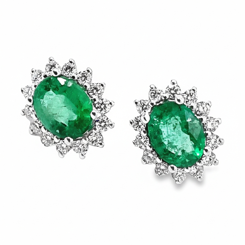 The stones are held in a secure, delicate basket setting made of 18K White Gold. This choice of metal provides a neutral, mirror-like backdrop. It allows the true colors of the emeralds to take center stage. These unique Emerald and Diamond Halo Earrings look amazing with any outfit, transitioning easily from day to night.