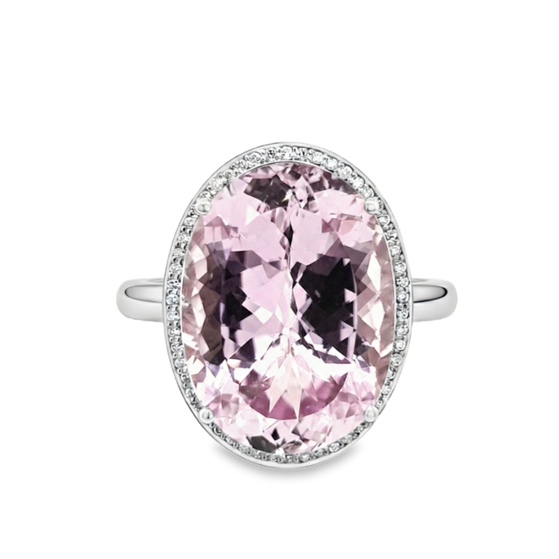 A refined halo of Natural Diamonds totaling 0.23 carats encircles the kunzite. These Round Brilliant cut diamonds offer a VS clarity and G color grade. We chose these stones specifically to provide maximum fire and sparkle. The clean white gold band ensures the focus remains entirely on the magnificent pink kunzite.