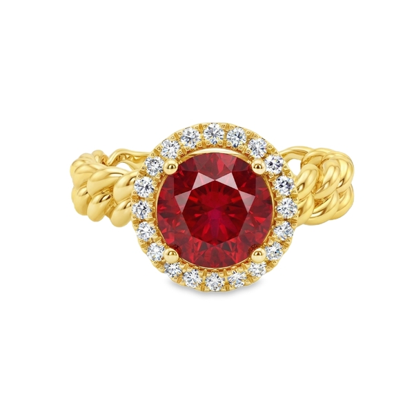 This is a stunning 18K gold ring featuring a vibrant, eye-catching natural Ruby as the centerpiece. The Ruby is certified by the International Gemological Institute (IGI), a reputable authority in gemstone grading. The Ruby is set in a classic prong setting, allowing maximum light to pass through and showcase its brilliance. It’s surrounded by a halo of sparkling diamonds, adding to the ring’s overall sparkle and elegance. The band of the ring appears to be crafted in a chunky, chain-link design, giving it a contemporary and edgy look. This design adds a touch of personality and makes the ring stand out.