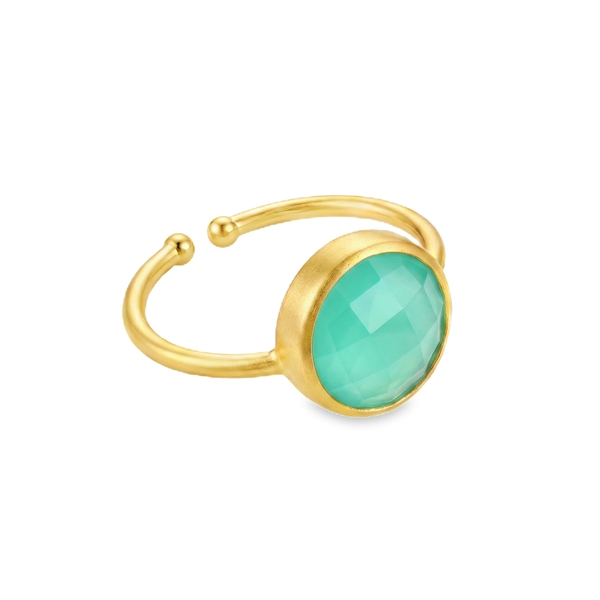 This sophisticated open-band ring of modern minimalist jewelry, is crafted in 925 sterling silver with a luxurious yellow gold plating. The centerpiece is a vibrant round cubic zirconia stone, cut in a beautiful faceted rose-cut. The opaque stone is perfectly complemented by the matte-brushed gold finish of the setting. This combination of the warm gold with the cool, eye-catching blue of the stone creates a versatile piece.