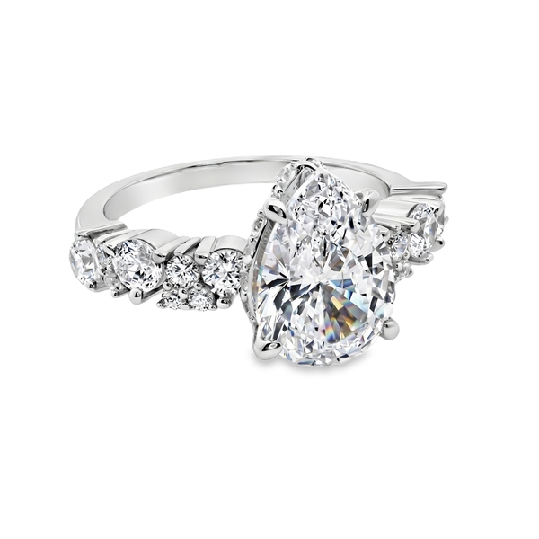This elegant ring is made from polished 925 Sterling Silver. Its center stone is a brilliant 3-carat size Cubic Zirconia (CZ), cut into a classic pear shape. Prongs hold this main gem securely. Smaller, brilliant-cut CZ stones are set around the center, creating an intricate cluster design. This setting adds a sophisticated look with a hint of vintage style. This exquisite piece offers amazing sparkle like a diamond, but at a better price. It is perfect as a cocktail ring, dress ring or promise piece.