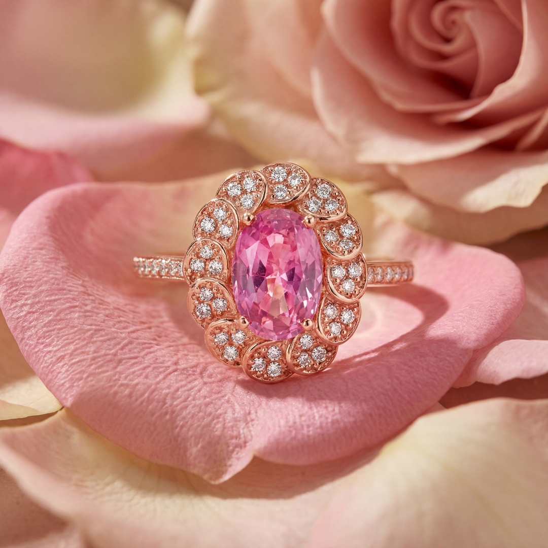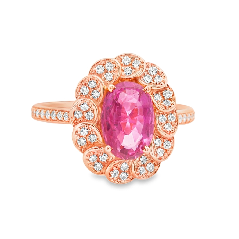 This enchanting ring features radiant 18 karat rose gold, showcasing a truly unique design. At its heart, a vibrant 1.17 carat natural pink sapphire glows with a soft, intense hue. This oval-cut sapphire is beautifully surrounded by a special halo. Here, individual petals cleverly alternate between polished rose gold and each petal is meticulously set with dazzling natural diamonds. These accent diamonds, totaling 0.20 carats, boost the sapphire’s brilliance and add to the ring’s overall sparkle. Delicate diamonds also adorn the ring’s shoulders, blending smoothly into the band. This piece beautifully combines the warmth of rose gold with the sparkle of diamonds and the charm of pink sapphire. It creates an elegant, eye-catching accessory, perfect for adding unique sophistication to any occasion.