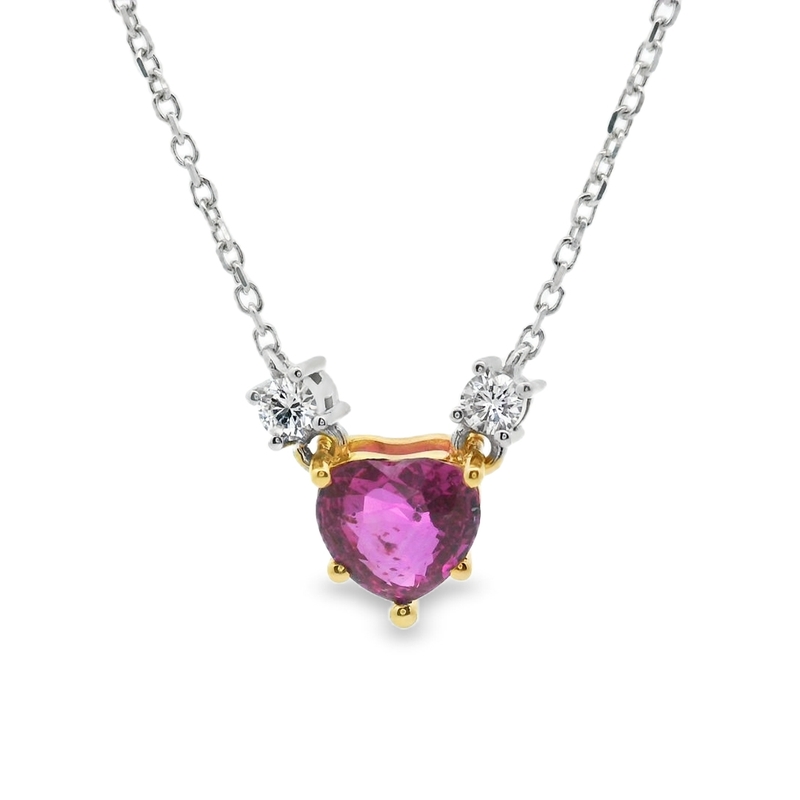 Celebrate love and elegance with this stunning Pink Sapphire Heart Pendant. This luxurious piece is crafted in 18-karat gold; consequently, it beautifully combines the warmth of yellow gold and the cool brilliance of white gold. The focal point is a magnificent 1.17 carat Pink Sapphire, which we cut into a captivating heart shape. This rich, vibrant sapphire sits securely in a polished 18K yellow gold setting. The exquisite colour of the pink sapphire makes a truly feminine and eye-catching statement.