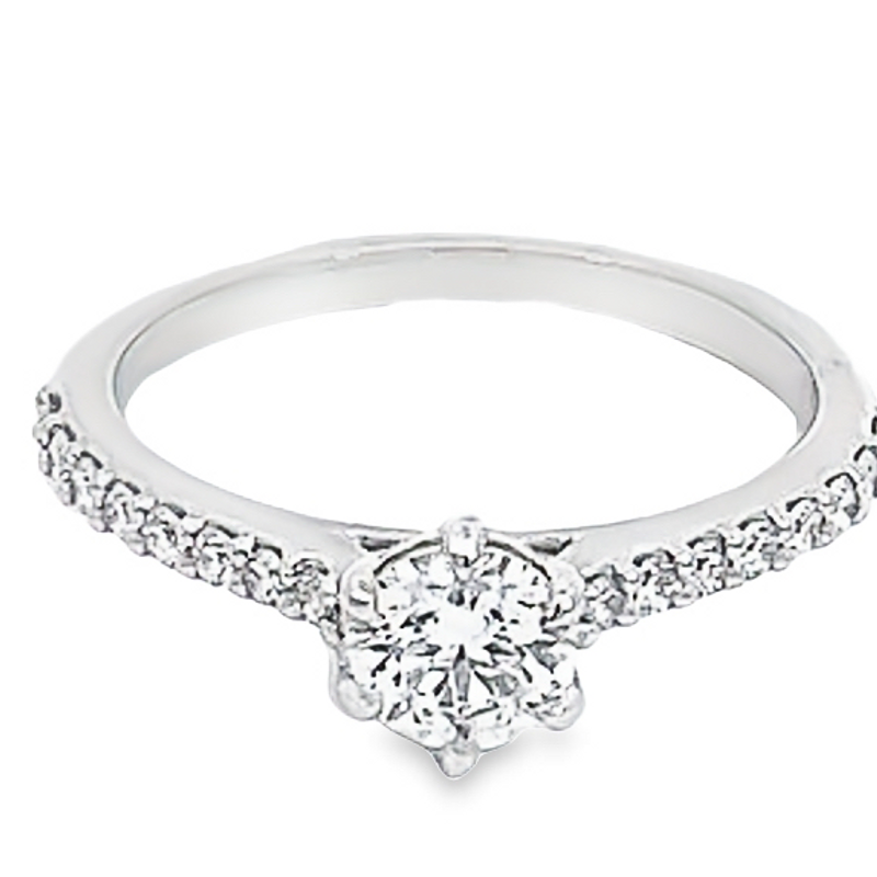 Introducing our captivating Platinum gold diamond engagement ring that effortlessly captures elegance and romance. This enchanting piece is meticulously crafted to symbolize everlasting love, making it the perfect choice for your momentous milestone. At the heart of this dazzling ring shines a magnificent 0.57 carats round brilliant cut diamond, expertly hand-selected for its unmatched beauty and brilliance. The central diamond has a laser inscription and it is certified by the Gemological Institute of America with a GIA Report no 7431394899.