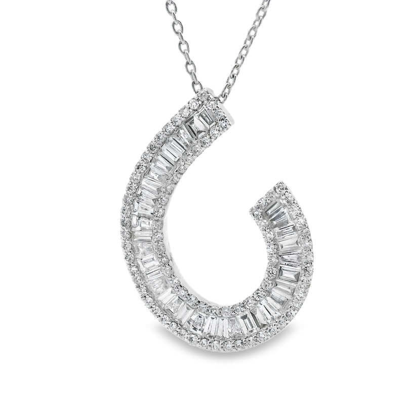 This diamond pendant is truly beautiful and substantial. It features 1.06 carats of diamonds, and we craft it in premium 18K White Gold. Therefore, this piece seamlessly combines a modern look with luxurious appeal. The pendant shows a graceful, contemporary curve. This design feature makes it a stunning diamond statement piece. It comes perfectly suspended from a durable, matching 18K gold chain.