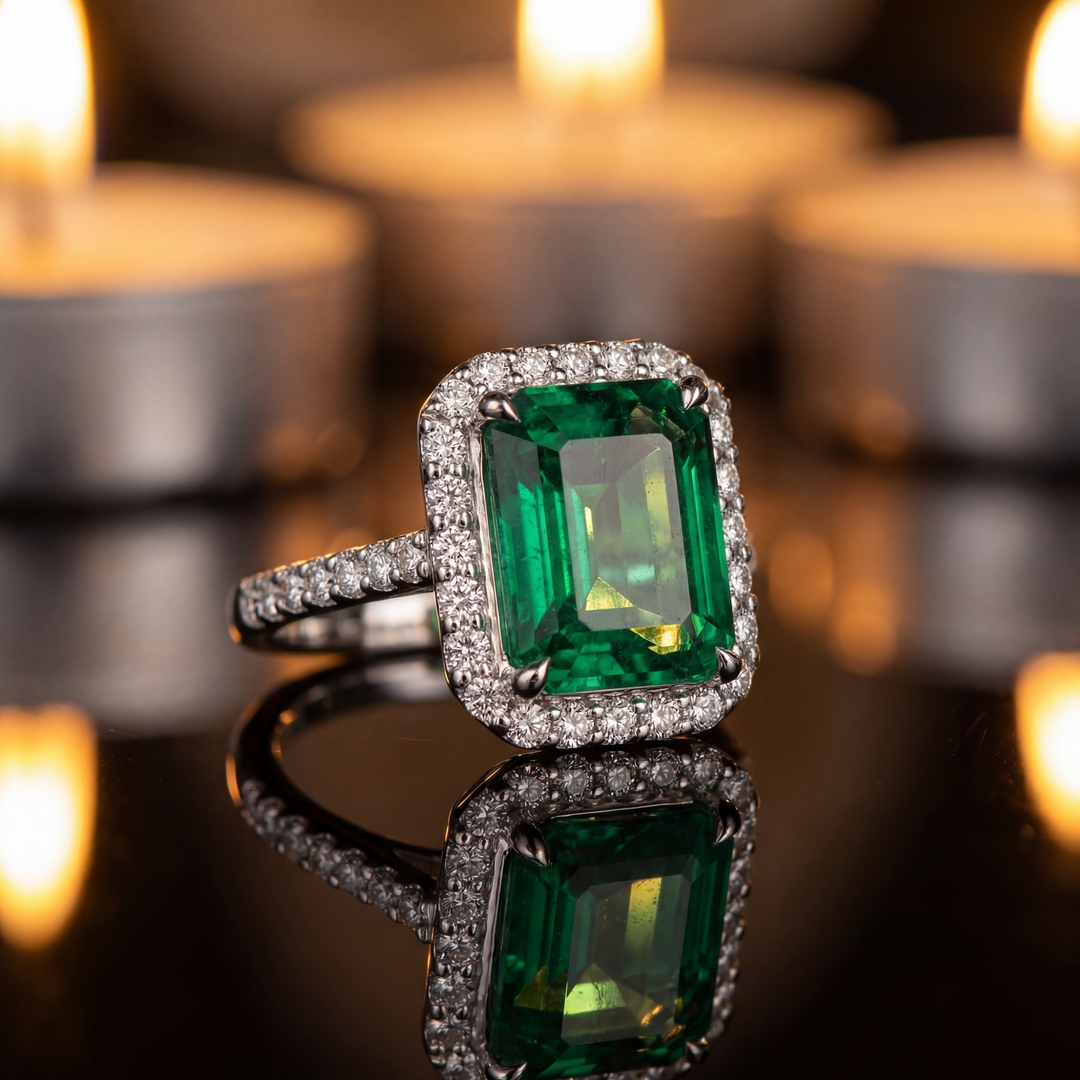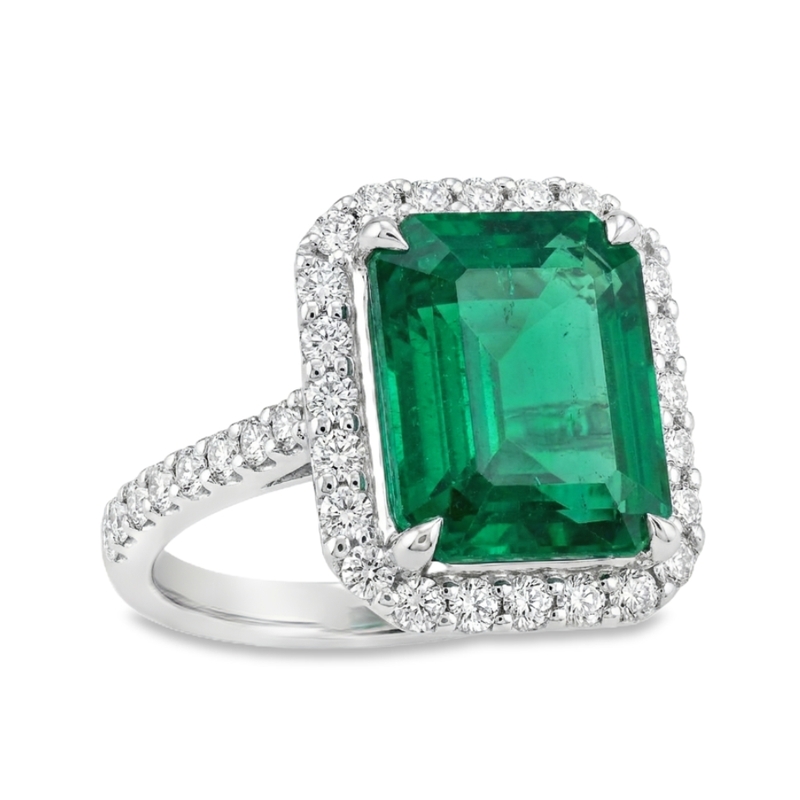 An exquisite ring showcases a vibrant Emerald as its centerpiece, surrounded by a halo of sparkling diamonds. The Emerald exhibits a rich, saturated green color, highly desirable in Emerald gemstones. A halo of small, round brilliant-cut diamonds surrounds the Emerald, enhancing its size and brilliance. Diamonds also set along the shoulders of the ring band add extra sparkle and complement the central halo design. This classic and elegant piece highlights the beauty of the central Emerald while diamonds enhance its presence and create a luxurious look. A timeless design results, suitable for special occasions or as a treasured piece for everyday wear.