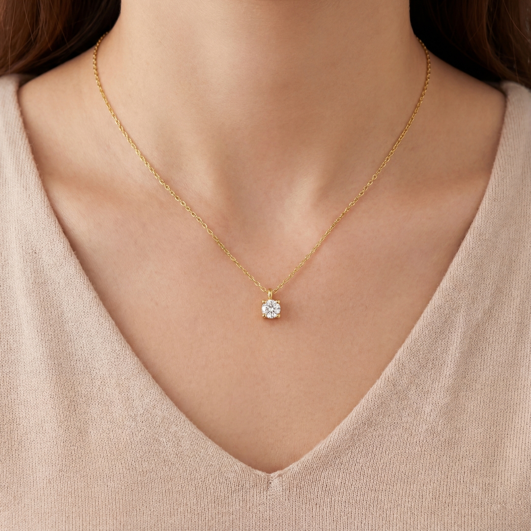 This round brilliant diamond necklace showcases a single, luminous diamond weighing 0.10 points. A traditional four-prong setting secures the stone, which maximizes light entry to ignite the diamond’s natural fire and brilliance. Crafted in 18K yellow gold, the pendant radiates a warm, polished glow that perfectly highlights the icy clarity of the center stone.