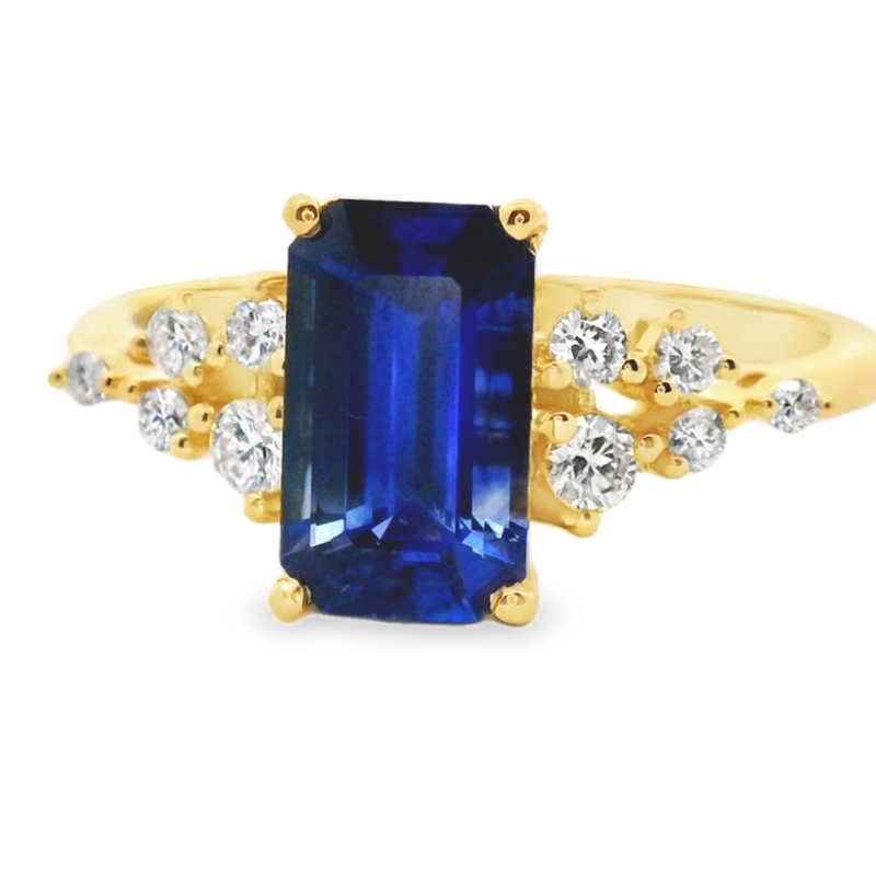 The striking, classic Modified Emerald Cut beautifully displays the sapphire’s intense, deep blue color and remarkable clarity. Four polished gold prongs securely hold the captivating gemstone. This setting emphasizes the stone’s elegant, rectangular shape. An asymmetrical cluster of brilliant, round-cut diamonds gorgeously frames the central Sapphire, totaling 0.21 carats. These diamonds are meticulously set to create a sparkling, starburst effect. They add a vibrant contrast to the deep sapphire and the warmth of the yellow gold. The exceptional colour of this natural Royal Blue Sapphire will leave you breathless.