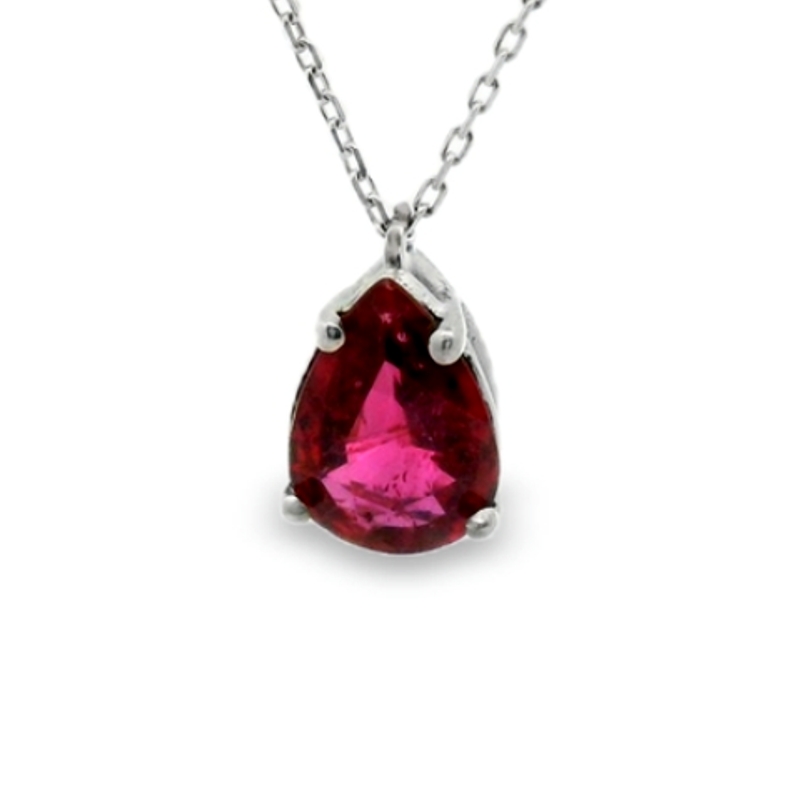 The Ruby Teardrop Pendant is securely held by a minimalist 18K white gold setting. The polished white gold offers a cool, lustrous contrast to the rich red of the ruby, creating a modern and luxurious aesthetic. This beautiful pendant is suspended from a matching 18K white gold cable chain, measuring 40cm in length. This length is specifically designed to sit elegantly at the collarbone, making it ideal for both daily wear and formal events.