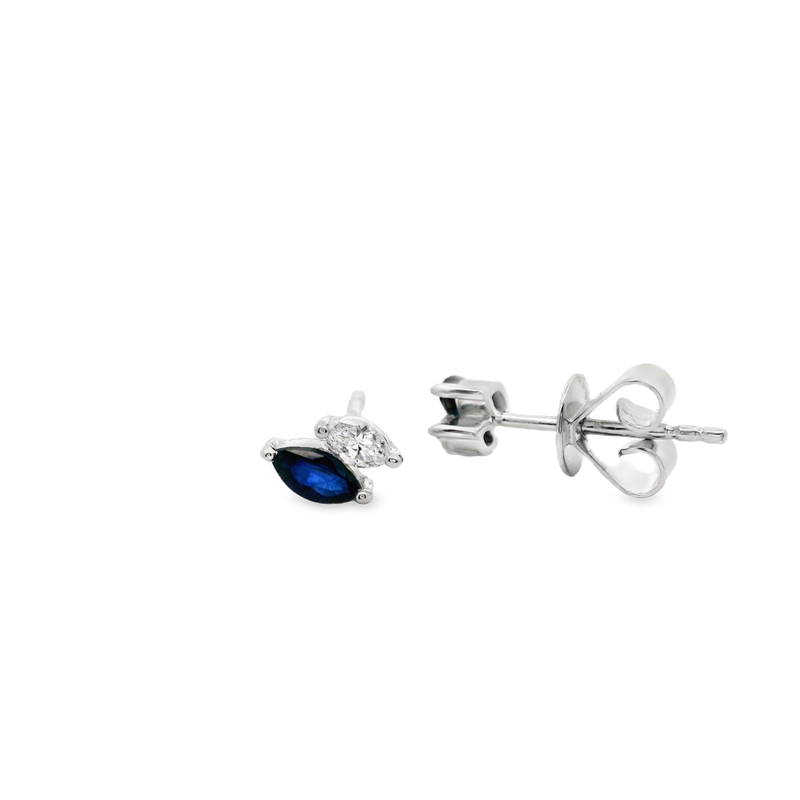 These are exquisite 18K White Gold Stud Earrings. They are a sophisticated statement piece. The design effortlessly combines the deep allure of blue sapphire with the brilliant sparkle of natural diamond. Each earring features a harmonious cluster setting. It showcases a stunning Marquise-cut natural Blue Sapphire. This totals an impressive 0.35 carats. The sapphire is elegantly paired with a sparkling Marquise-cut natural Diamond. This totals 0.14 carats. The rich, intense blue colour of the sapphires is striking. It is perfectly complemented by the near-colourless brilliance of the diamonds. All stones are securely set in luminous 18-karat white gold. The earrings are designed for comfort and secure wear. These studs fasten with classic butterfly backs. They are ideal for everyday luxury or a captivating accent for an evening out. This timeless piece makes a perfect gift. Consider it for an anniversary, birthday, or just to cherish a loved one.
