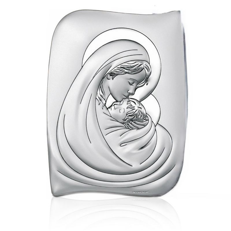 This stunning silver icon features a beautifully detailed depiction of the Virgin Mary cradling Baby Jesus in her arms. The intricate design captures the serene love and devotion between mother and child, making it a timeless and cherished piece for any religious collection. The silver shines brilliantly, adding a touch of elegance to this sacred symbol.