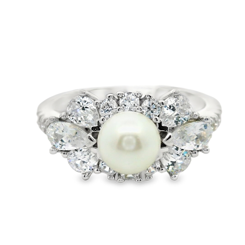 The Silver Pearl Zircon Ring showcases a stunning floral-inspired halo of clear cubic zircons. A mix of round and pear-cut stones surrounds the central pearl to create a high-contrast look. These precision-faceted zircons catch the light beautifully to provide a superior brilliance. The pavé-set stones along the shoulders add even more shimmer to the polished band. This piece works perfectly for weddings, anniversaries, or sophisticated evening events.