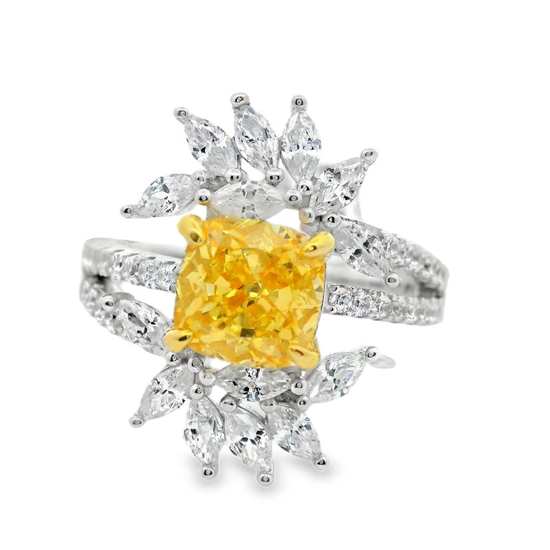 The center stone is flanked by an asymmetric sunburst of marquise-cut cubic zirconia. These shimmering accents are arranged to resemble rays of light, providing a dynamic and unique silhouette. Furthermore, the split-shank band is pavé-set with additional round cubic zirconia for maximum brilliance. Because of its bold and cheerful design, this Silver Yellow CZ Ring is an ideal choice for those who love unique statement jewelry. We invite you to explore how this radiant piece can transform your look today.