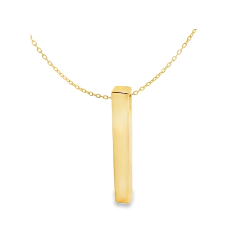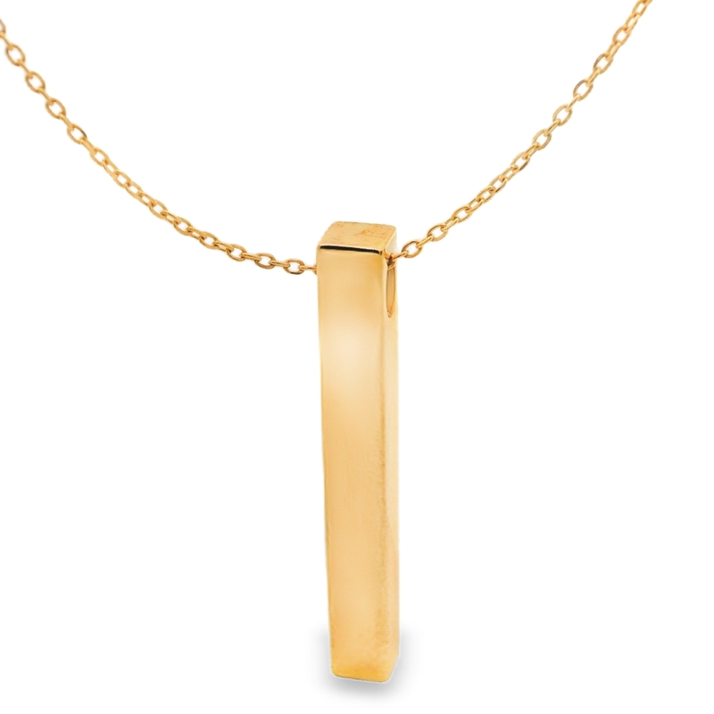 This modern and sophisticated necklace showcases a sleek, polished vertical bar pendant crafted from highly reflective 18K rose gold. The substantial pendant features a clean, four-sided design. It hangs horizontally from a delicate 18 karat rose gold chain, which threads directly through a hidden opening at the top of the bar. This timeless, minimalist piece offers a contemporary look that is perfect for layering and works wonderfully as a clean canvas for custom engraving.