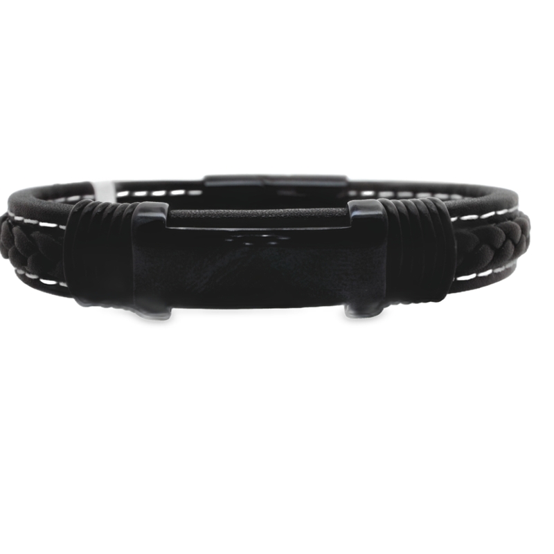 Smooth black material, borders the braided section, creating a layered look. Its black color blends seamlessly with the leather, creating a unified look. White contrast stitching along the edges of the smooth black sections adds a light contrast and reinforces the construction.