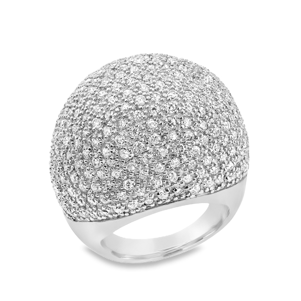 The piece showcases a bold, dome-shaped “bombé” design, meticulously encrusted with a dense pavé of brilliant-cut Cubic Zircons. Each stone is precision-set to create a continuous surface of breathtaking shimmer, mimicking the fire and brilliance of natural diamonds. The smooth, polished band ensures a comfortable fit while maintaining the ring’s substantial and sophisticated silhouette.