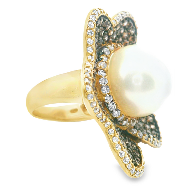 Add a touch of feminine elegance to your collection with this stunning sterling silver 925 ring. The ring features a delicate flower design adorned with sparkling cubic zirconia stones in various shades of brown and white, creating a beautiful contrast. A lustrous shell pearl sits at the center of the flower, adding a touch of classic sophistication. This ring is perfect for both casual and formal occasions, making it a versatile addition to your jewelry wardrobe.