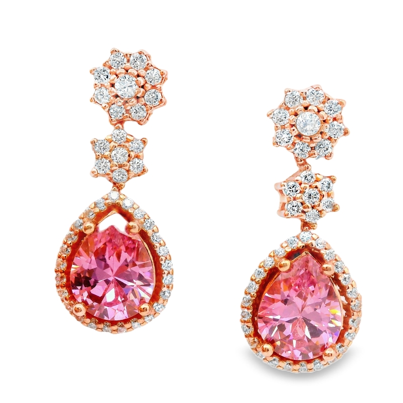 These elegant drop earrings showcase a beautiful blend of rosy hues and sparkling brilliance. Crafted from sterling silver 925 with a warm rose gold plating, they exude a touch of romantic sophistication. Each earring features a delicate floral-inspired top adorned with shimmering cubic zirconia stones, leading to a smaller, star-shaped element, also set with dazzling CZs. The focal point is a captivating, pear-shaped pink stone, surrounded by a halo of smaller, sparkling CZs. The design creates a graceful, cascading effect, perfect for adding a touch of glamour to any occasion.