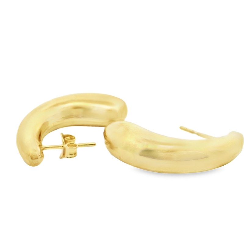 These striking stud earrings feature a bold, sculptural design. Crafted in a warm yellow gold tone, each earring showcases a thick, curved form with a high-polished finish. The rounded, almost tubular shape creates a substantial and eye-catching look, while the smooth surface reflects light beautifully. Their unique, contemporary aesthetic makes them a statement piece, perfect for adding a touch of modern artistry to any outfit.