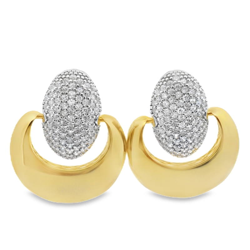 The earrings are made of sterling silver 925 with a yellow gold plating. Each earring has a polished yellow gold crescent shape at the bottom. An oval shape covered in sparkling cubic zirconia stones hangs from the crescent. The mix of the warm gold and the bright white stones makes the earrings look fancy and high-quality. The contrast between the shiny cubic zirconia on top and the smooth gold on the bottom is stylish. These earrings have a classic yet trendy design, good for both daily wear and special events.