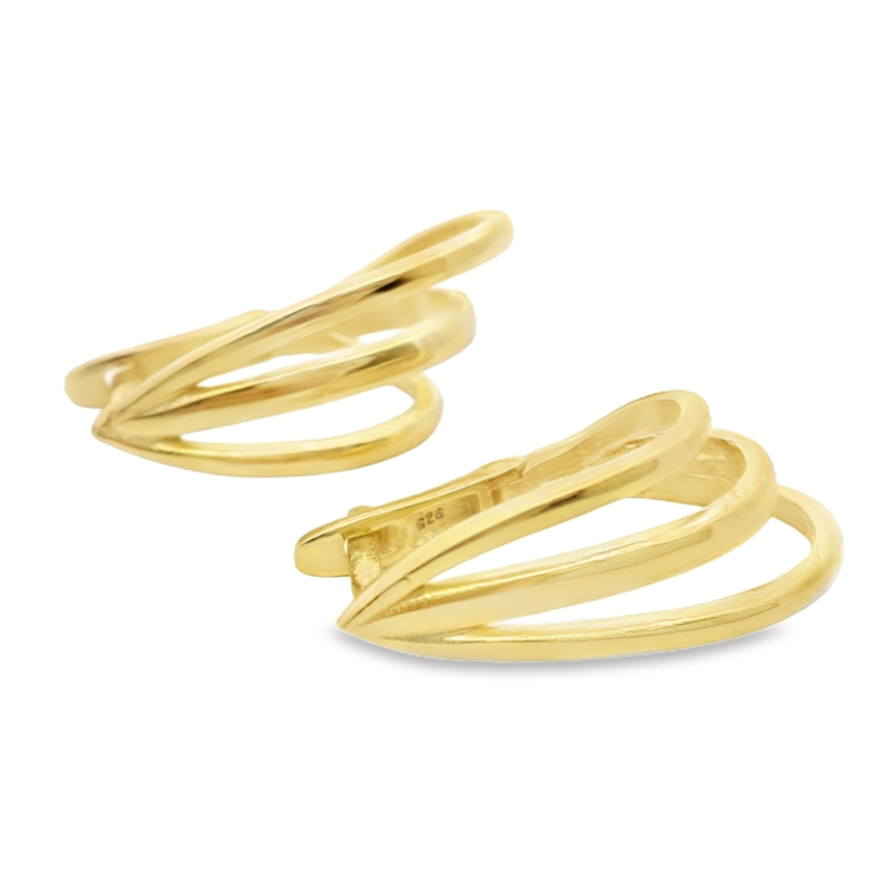 These stylish sterling silver earrings feature a modern and minimalist design. Crafted in a yellow gold-plated tone, each earring consists of three sleek, curved bars that appear to emerge from a single point on the earlobe. The bars have a polished finish, reflecting light and adding a subtle shine. Their open, airy design makes them a contemporary and versatile accessory, suitable for adding a touch of understated elegance to both casual and more dressed-up looks.