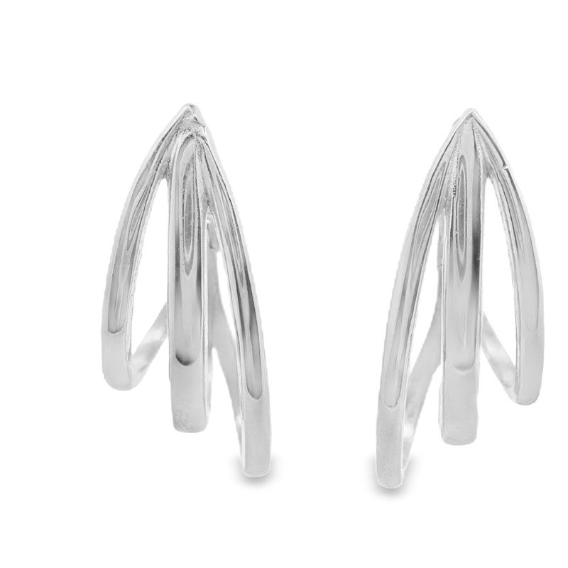 These sleek stud earrings feature a modern and minimalist design. Crafted in a cool, bright sterling silver, each earring consists of three slender, curved bars that appear to emerge from a single point on the earlobe. The bars have a polished finish, reflecting light and adding a subtle shine. Their open, airy design makes them a contemporary and versatile accessory, suitable for adding a touch of understated elegance to both casual and more dressed-up looks.