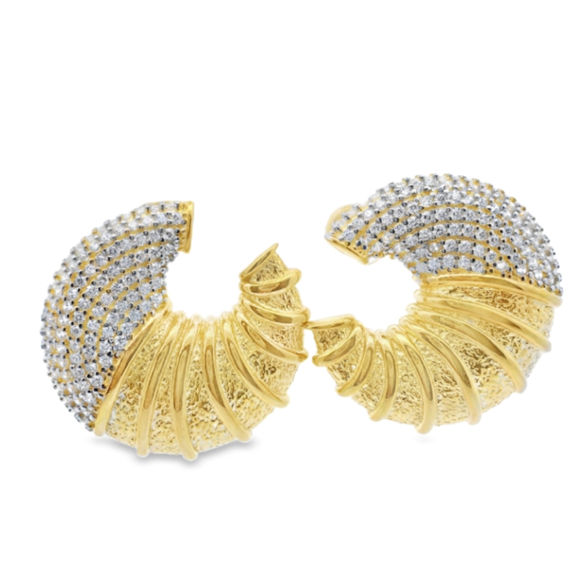 Elevate your jewelry collection with these unique hoop earrings. Crafted from sterling silver 925 with a rich yellow gold plating, these earrings feature a textured, ridged design on the lower portion and a sparkling expanse of pavé-set stones on the upper half. Secure and stylish, these earrings are sure to turn heads.